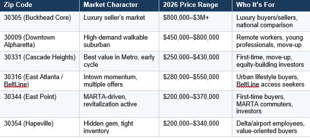 These six zip codes represent the most strategically significant Fulton County real estate markets in 2026 — one luxury, one suburban, two intown, and two South Fulton value markets.