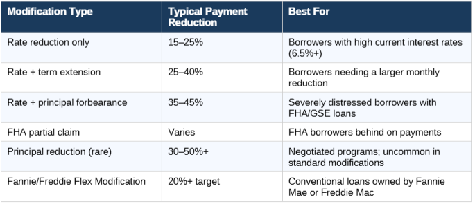The floor: If your current rate is already low — say 3.5% from a 2019 refinance — a rate reduction modification may produce little to no change. Term extension becomes the primary lever and the reduction may be modest. Conversely, loans at 7% or higher have significant modification room, and payment reductions of $800–$1,200 per month are possible with the right program.