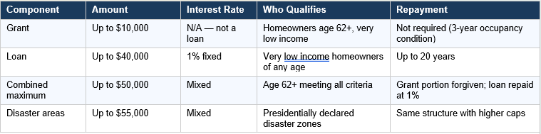 The grant portion — up to $10,000, never repaid — requires the applicant to be age 62 or older. The loan portion is available to income-qualifying homeowners of any age. A senior who is 62 or older and meets the income requirement can access both components simultaneously up to the $50,000 combined maximum.