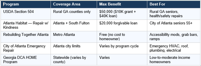 For Atlanta city and Fulton County seniors who don’t qualify due to the urban geographic designation, Atlanta Habitat for Humanity’s Repair with Kindness program is the most comparable alternative. It provides up to $20,000 in critical repairs through a 5-year forgivable loan — effectively twice the grant equivalent of Section 504 — and specifically serves the urban Atlanta population that Section 504 does not. For free accessibility modifications, Rebuilding Together Atlanta serves Metro Atlanta at no cost. ATL Home Help Solutions can help you identify which combination of programs applies to your specific property address and repair needs.